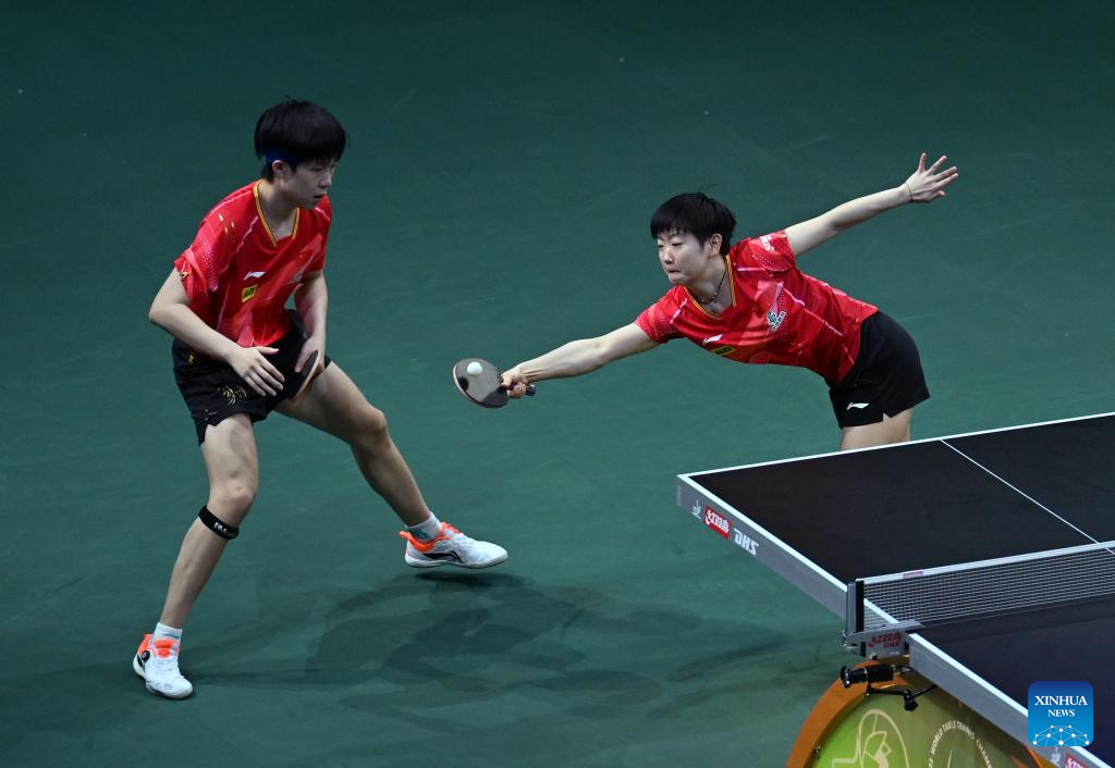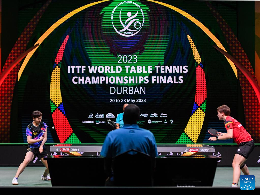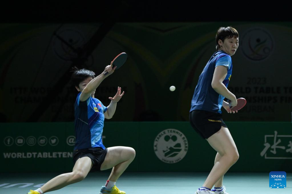 Wang Manyu (R)/Sun Yingsha of China compete against Cheng I-Ching/Li Yu-Jhun of Chinese Taipei during the women's doubles quarterfinal match at 2023 ITTF Table Tennis World Championships Finals in Durban, South Africa, May 25, 2023. (Xinhua/Han Xu)