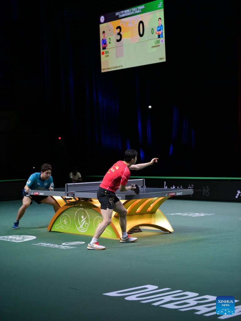 Ma Long (R) of China serves during the men's singles round of 16 match against Lim Jonghoon of South Korea at 2023 ITTF Table Tennis World Championships Finals in Durban, South Africa, May 25, 2023. (Xinhua/Han Xu)