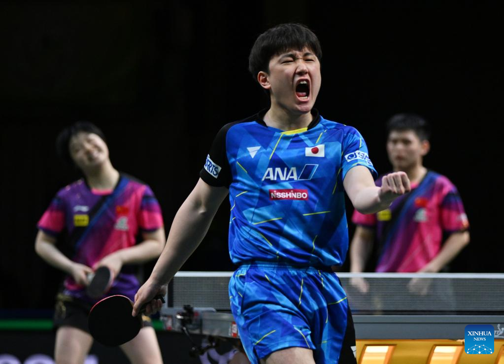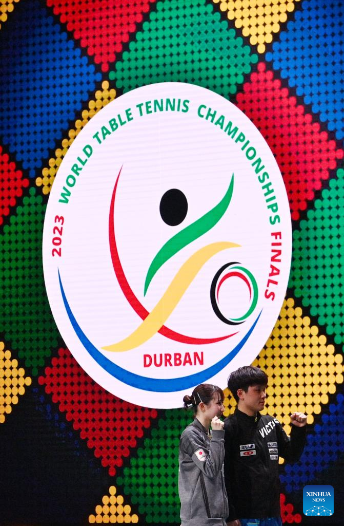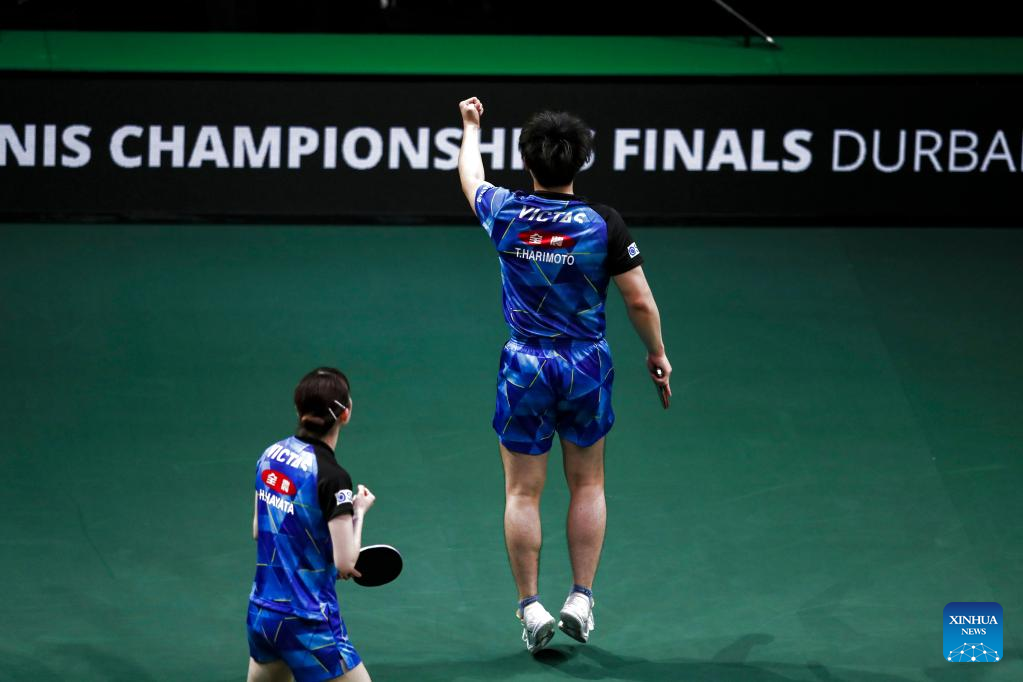 Harimoto Tomokazu (R)/Hayata Hina of Japan celebrate after the mixed doubles semifinal against Lin Shidong/Kuai Man of China at 2023 ITTF Table Tennis World Championships Finals in Durban, South Africa, May 25, 2023. (Xinhua/Tao Xiyi)