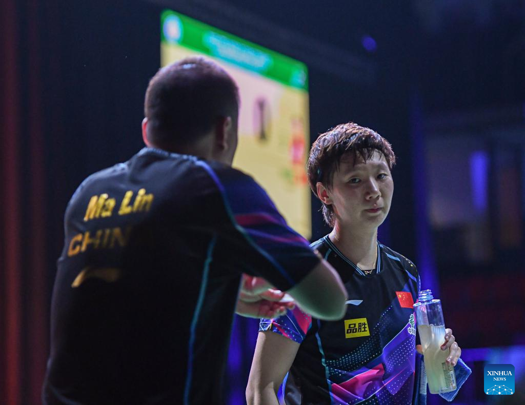 Coach Ma Lin (L) instructs Wang Manyu of China during her women's singles round of 16 match against Nina Mittelham of Germany at 2023 ITTF Table Tennis World Championships Finals in Durban, South Africa, May 25, 2023. (Xinhua/Li Yahui)