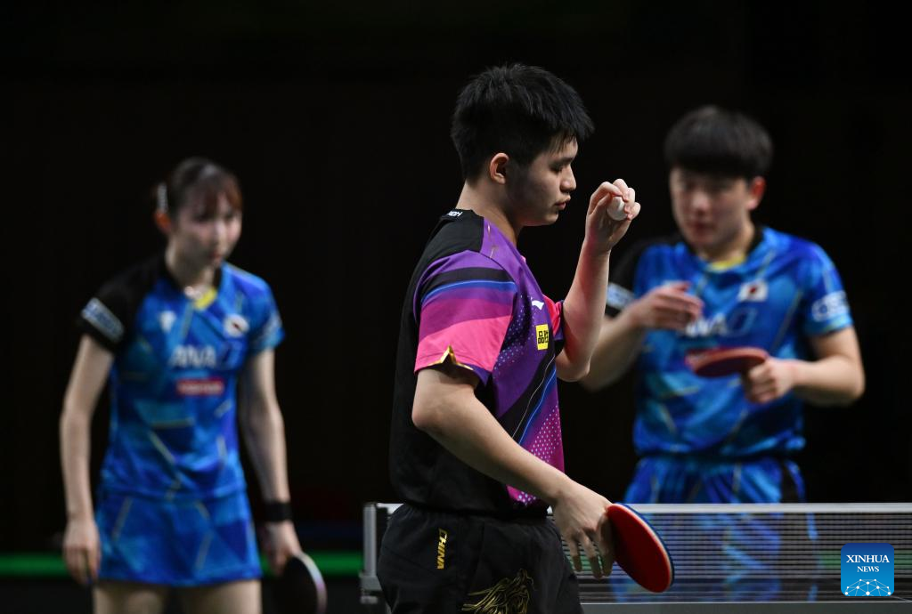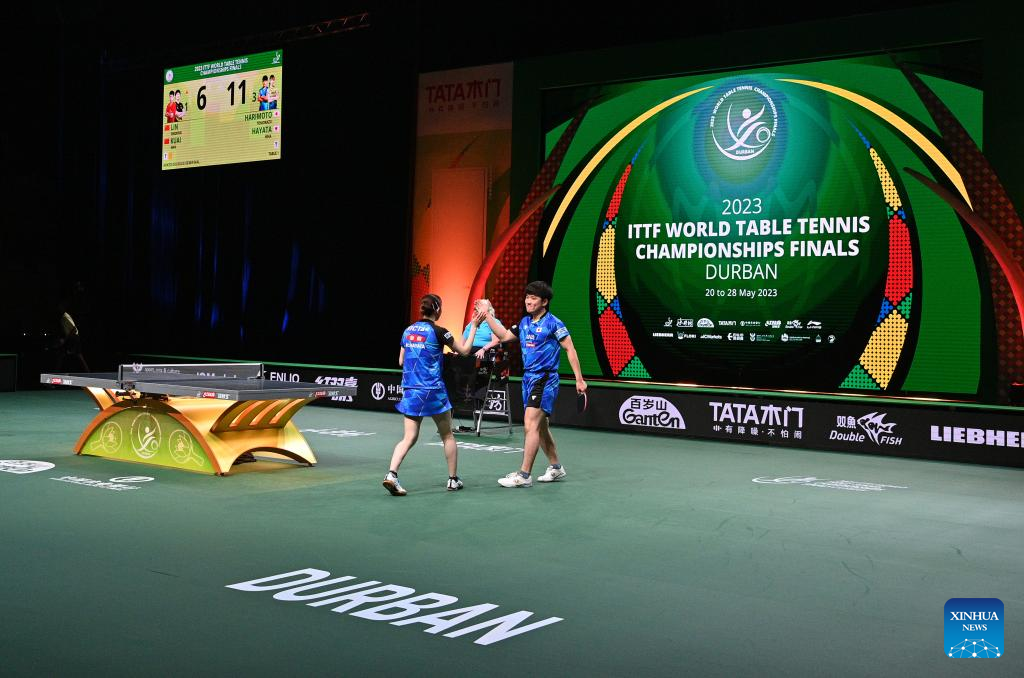 Lin Shidong(R)/Kuai Man of China compete during the mixed doubles semifinal match against Harimoto Tomokazu/Hayata Hina of Japan at 2023 ITTF Table Tennis World Championships Finals in Durban, South Africa, May 25, 2023. (Xinhua/Tao Xiyi)