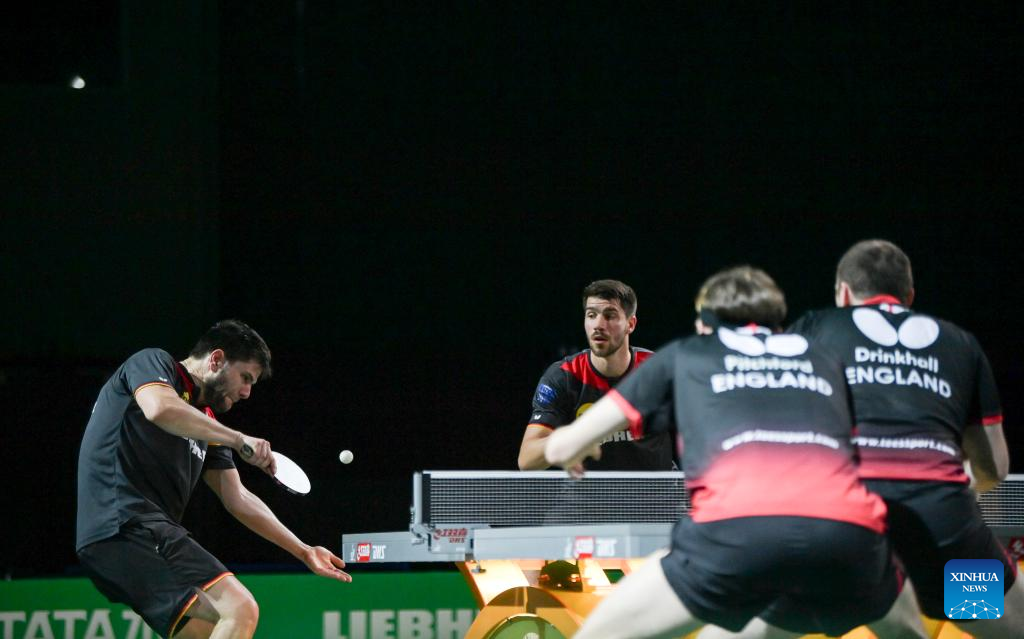 Liam Pitchford/Paul Drinkhall(front) of England compete during the men's doubles quarterfinal against Dimitrij Ovtcharov/Patrick Franziska of Germany at 2023 ITTF Table Tennis World Championships Finals in Durban, South Africa, May 25, 2023. (Xinhua/Han Xu)