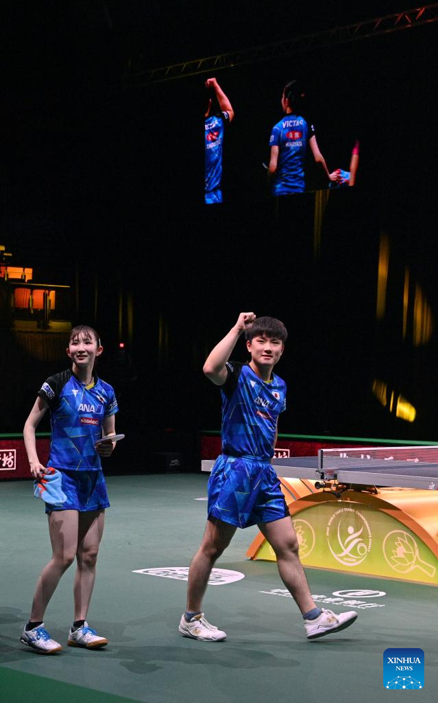 Harimoto Tomokazu (R)/Hayata Hina of Japan celebrate during the mixed doubles semifinal against Lin Shidong/Kuai Man of China at 2023 ITTF Table Tennis World Championships Finals in Durban, South Africa, May 25, 2023. (Xinhua/Zhang Yudong)