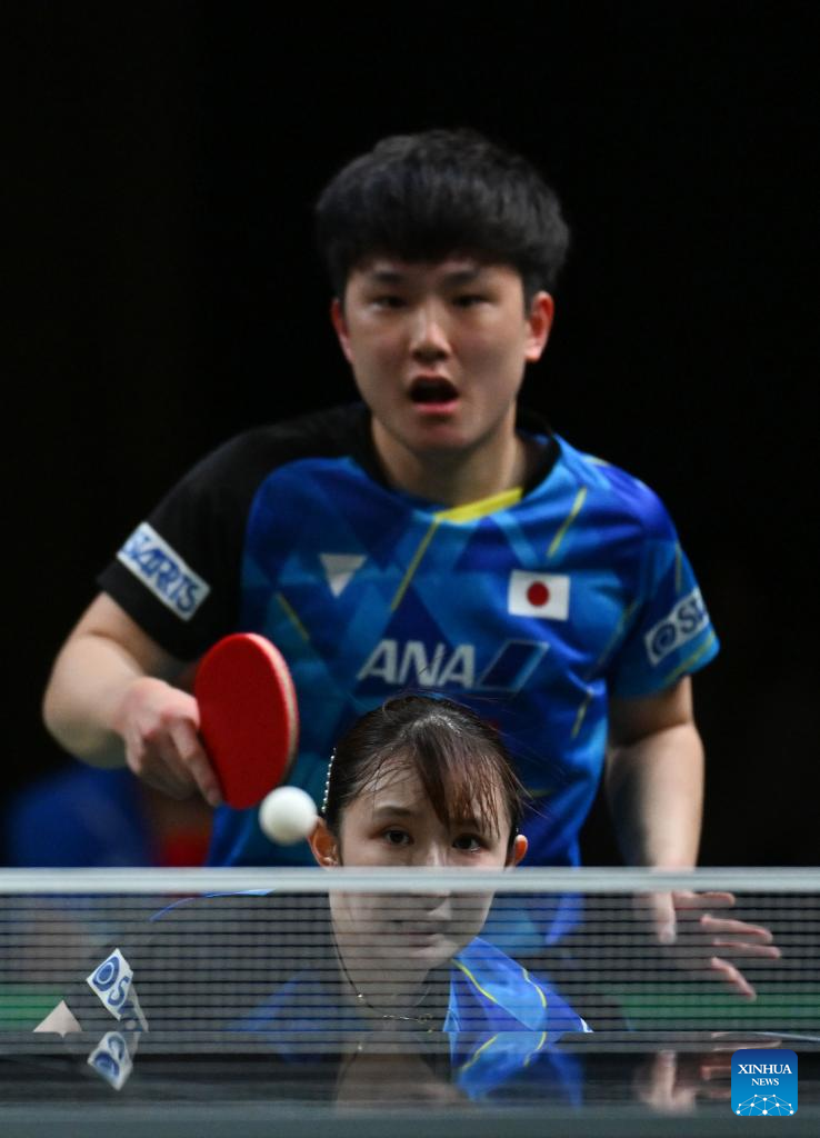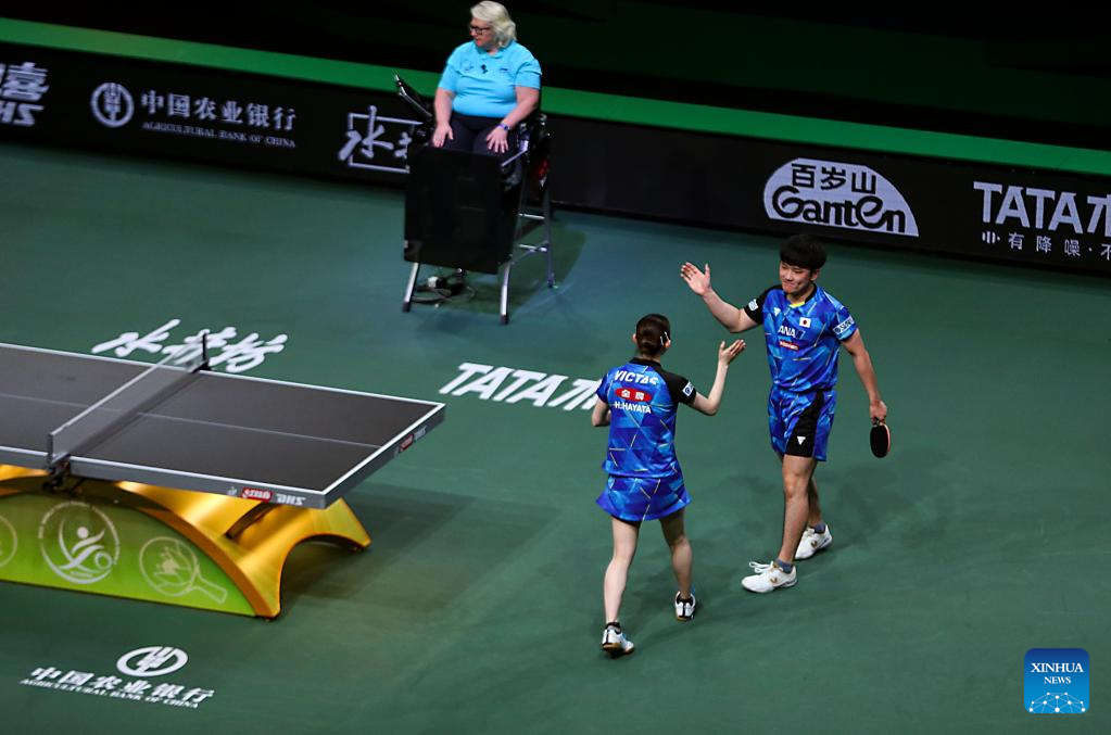 Harimoto Tomokazu (R)/Hayata Hina of Japan compete during the mixed doubles semifinal against Lin Shidong/Kuai Man of China at 2023 ITTF Table Tennis World Championships Finals in Durban, South Africa, May 25, 2023. (Xinhua/Zhang Yudong)