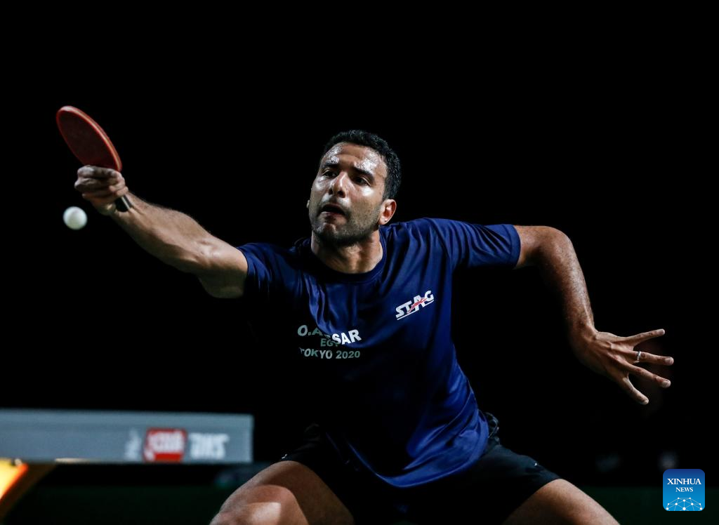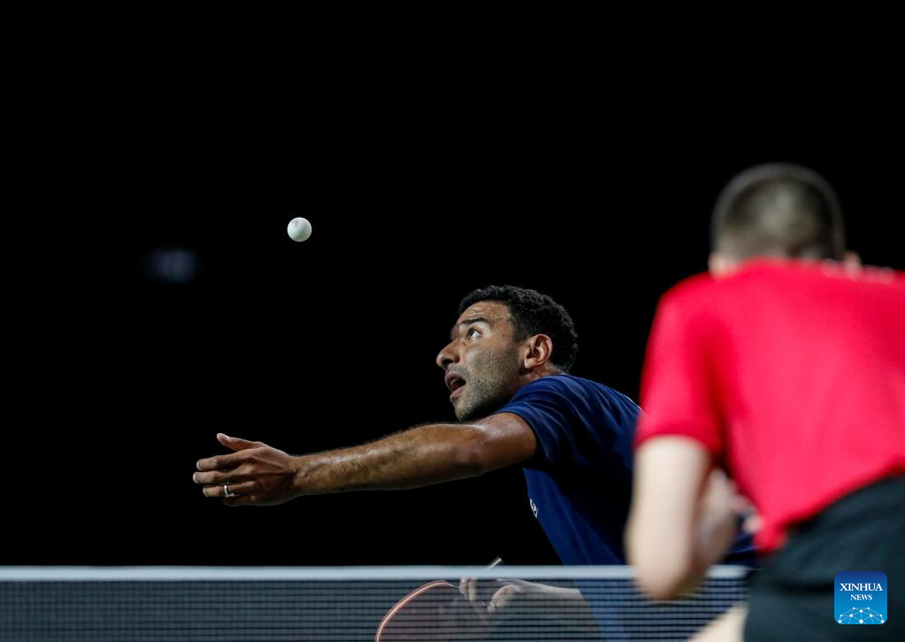 Omar Assar of Egypt competes during the men's singles round of 16 match against Tomislav Pucar of Croatia at 2023 ITTF Table Tennis World Championships Finals in Durban, South Africa, May 25, 2023. (Xinhua/Li Yahui)