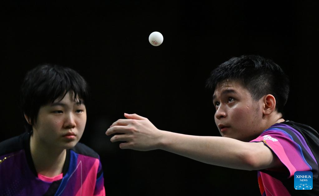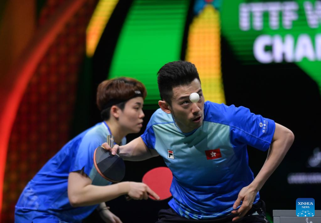 Wong Chun Ting (R)/Doo Hoi Kem compete during the mixed doubles semifinal between Wang Chuqin/Sun Yingsha of China and Wong Chun Ting/Doo Hoi Kem of China's Hong Kong at 2023 ITTF Table Tennis World Championships Finals in Durban, South Africa, May 25, 2023. (Xinhua/Han Xu)