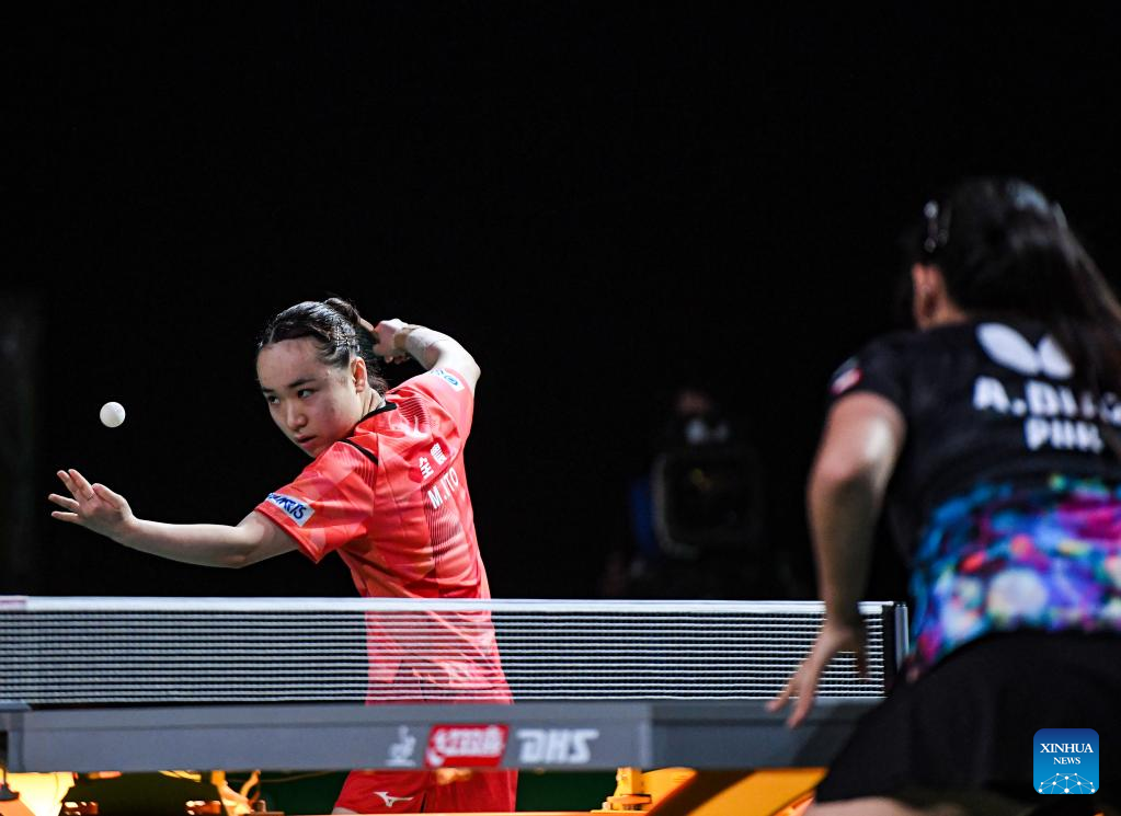 Ito Mima of Japan serves during the women's singles round of 16 match against Adriana Diaz of Puerto Rico at 2023 ITTF Table Tennis World Championships Finals in Durban, South Africa, May 25, 2023. (Xinhua/Li Yahui)