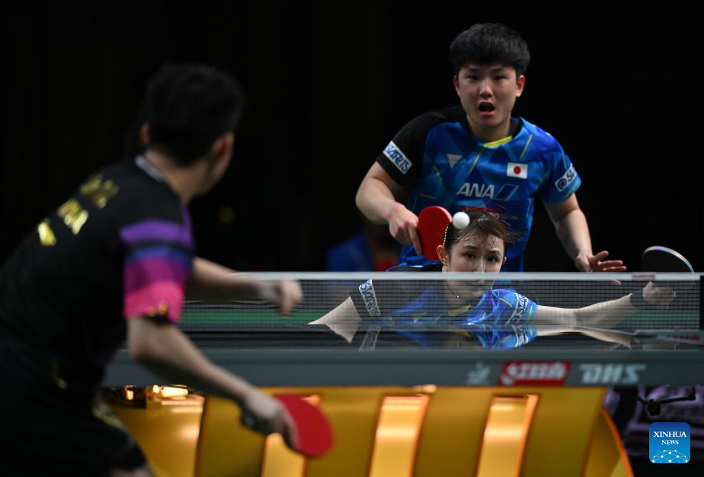 Harimoto Tomokazu (top)/Hayata Hina of Japan compete during the mixed doubles semifinal against Lin Shidong/Kuai Man of China at 2023 ITTF Table Tennis World Championships Finals in Durban, South Africa, May 25, 2023. (Xinhua/Tao Xiyi)