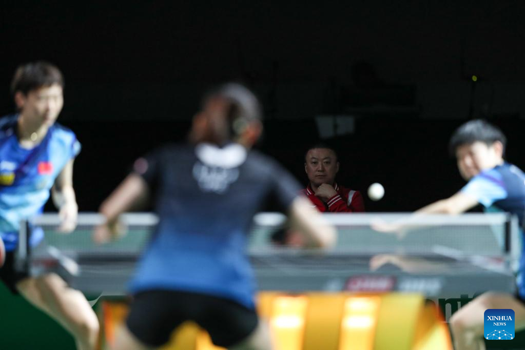 Coach Ma Lin (2nd R) is seen during the women's doubles quarterfinal match between Wang Manyu/Sun Yingsha of China and Cheng I-Ching/Li Yu-Jhun of Chinese Taipei at 2023 ITTF Table Tennis World Championships Finals in Durban, South Africa, May 25, 2023. (Xinhua/Han Xu)