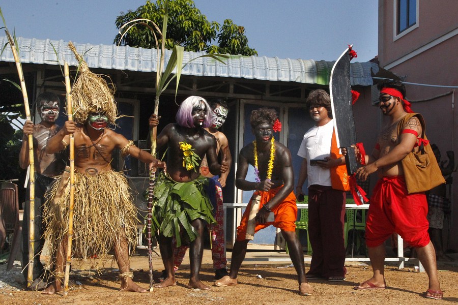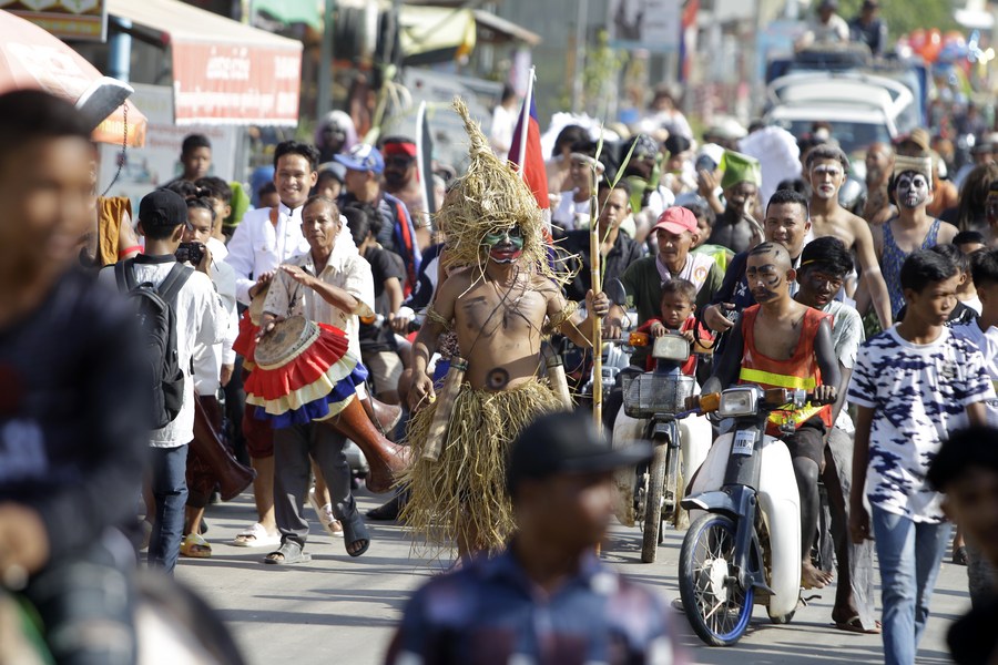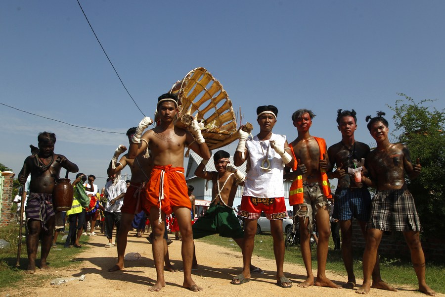 PHNOM PENH, May 25 (Xinhua) -- Dozens of villagers on the northwest outskirts of Phnom Penh in Cambodia painted their faces and bodies as well as donned grass skirts on Wednesday as they celebrated an annual traditional ritual to ask a "guardian spirit" to bring good fortune and rain for their rice crop.