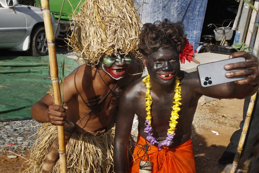 Villagers take a selfie during a "guardian spirit" ritual in Phnom Penh, Cambodia on May 24, 2023. (Photo by Phearum/Xinhua)