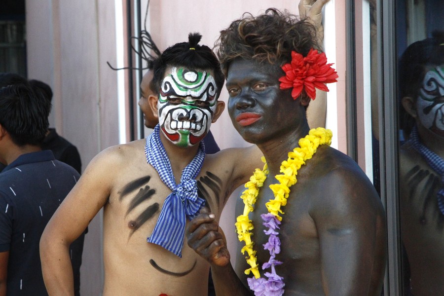 Villagers wear grass skirts and paint their faces during a "guardian spirit" ritual in Phnom Penh, Cambodia on May 24, 2023. (Photo by Phearum/Xinhua)