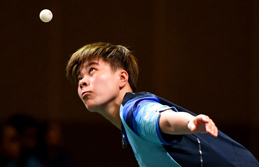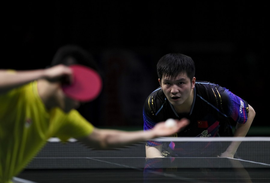 Fan Zhendong of China reacts during the men's singles third round match against Wong Chun Ting of China's Hong Kong at 2023 ITTF Table Tennis World Championships Finals in Durban, South Africa, May 24, 2023. (Xinhua/Zhang Yudong)