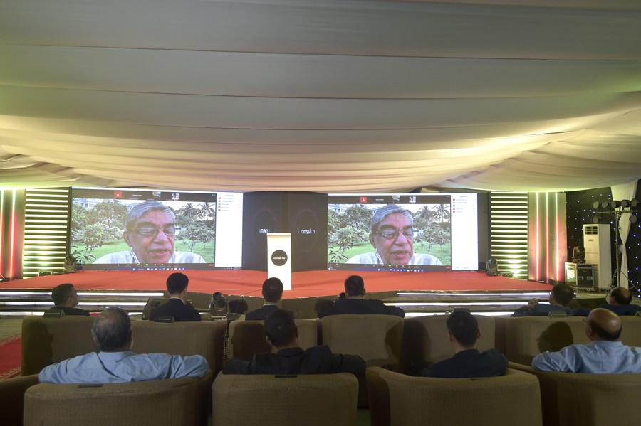 Bangladeshi Posts and Telecommunications Minister Mustafa Jabbar speaks via video link at the inauguration ceremony of the new factory of Transsion Holdings in the Meghna Industrial Economic Zone, Narayanganj, Bangladesh, May 24, 2023. (Xinhua)