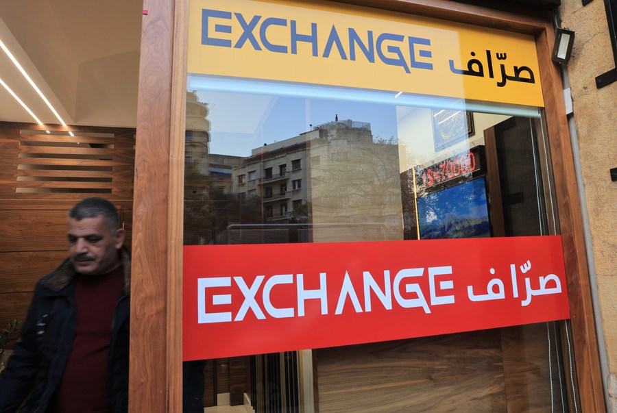 A man walks out of a foreign exchange office in Beirut, Lebanon, on Feb. 14, 2023. The Lebanese pound on Tuesday sank to a new record low of 74,000 against one U.S. dollar on the parallel market, Elnashra news website reported. (Xinhua/Liu Zongya)