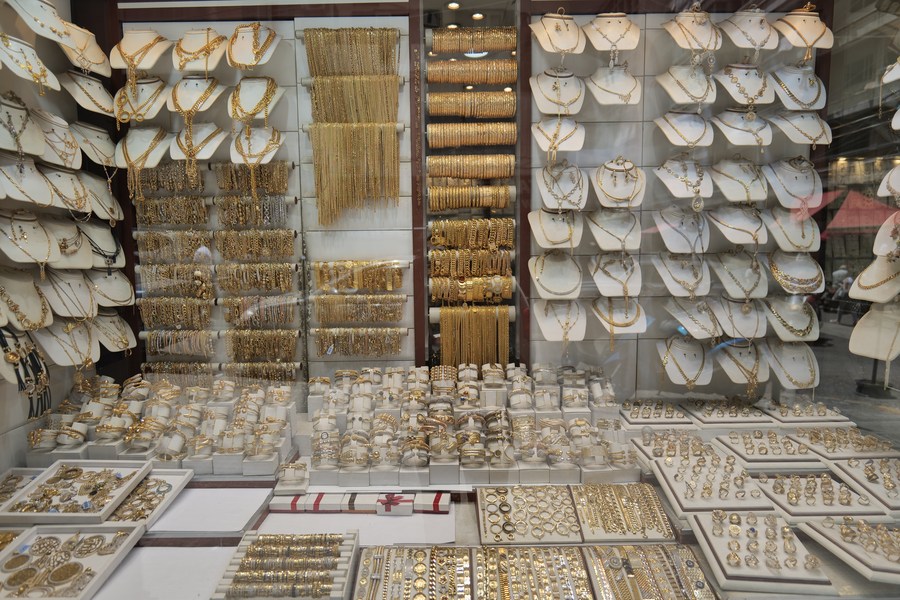 Pieces of gold jewelry displayed at a shop in Beirut, Lebanon, on May 27, 2023. (Photo by Dana Halawi/Xinhua)