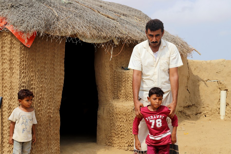 An ailing seven-year-old Yemeni child who cannot get access to proper medication stands in front of his family hut with the help of his father in Midi District, Hajjah Province, northern Yemen, on May 25, 2023. (Photo by Mohammed al-Wafi/Xinhua) ■