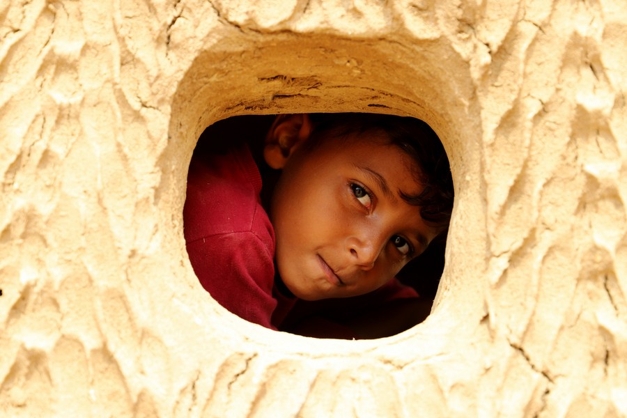An ailing seven-year-old Yemeni child looks out via the window of his family hut in Midi District, Hajjah Province, northern Yemen, on May 25, 2023. (Photo by Mohammed al-Wafi/Xinhua)