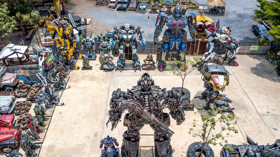 This aerial photo taken on May 25, 2023, shows robots made from scrap metal at the Transformer Museum in Ang Thong, Thailand. (Xinhua/Wang Teng)