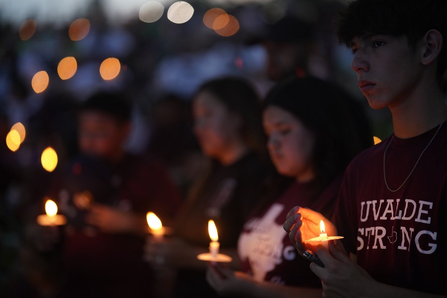 People attend a candlelight vigil for victims of a school mass shooting in Uvalde, Texas, the United States on May 24, 2023. (Xinhua/Wu Xiaoling)