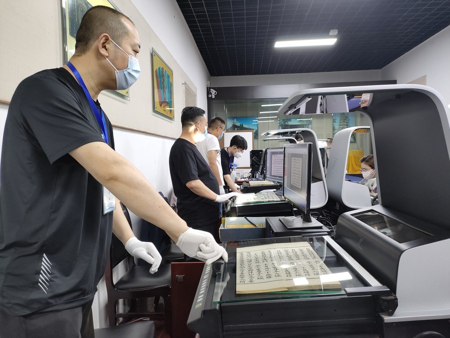 This undated photo provided by the cultural relics institute of Zhangye Giant Buddha Temple shows technicians digitalizing items preserved in the Giant Buddha Temple in Zhangye City, northwest China's Gansu Province. (The cultural relics institute of Zhangye Giant Buddha Temple/Handout via Xinhua)