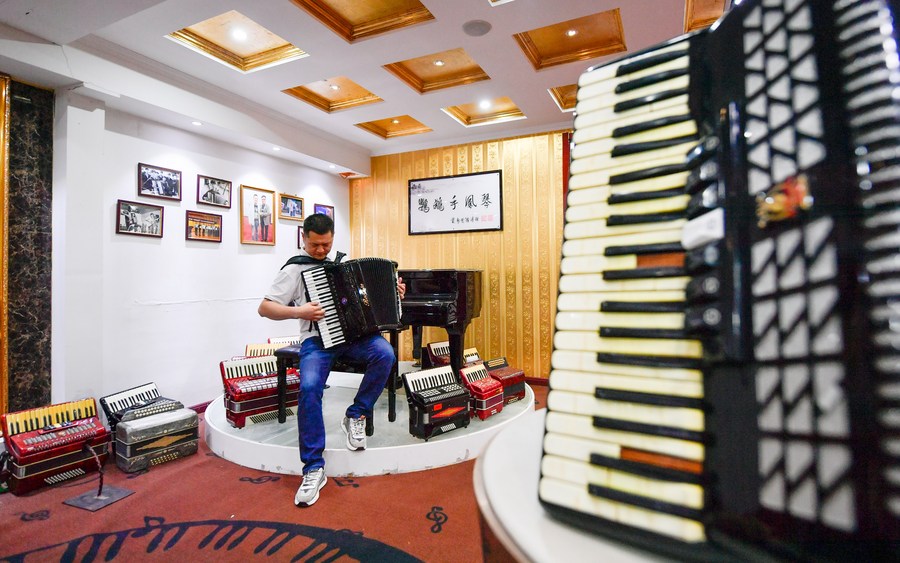 A worker plays music with an accordion at Tianjin Yingwu Musical Instrument Co., Ltd. in Zhongwang Town of Jinghai District, north China's Tianjin, May 25, 2023. (Xinhua/Sun Fanyue)