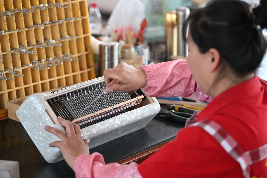 A worker assembles an accordion at a workshop of Tianjin Yingwu Musical Instrument Co., Ltd. in Zhongwang Town of Jinghai District, north China's Tianjin, May 25, 2023. (Xinhua/Sun Fanyue)