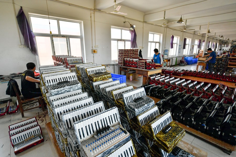 Workers assemble accordions at a workshop of Tianjin Yingwu Musical Instrument Co., Ltd. in Zhongwang Town of Jinghai District, north China's Tianjin, May 25, 2023. (Xinhua/Sun Fanyue)