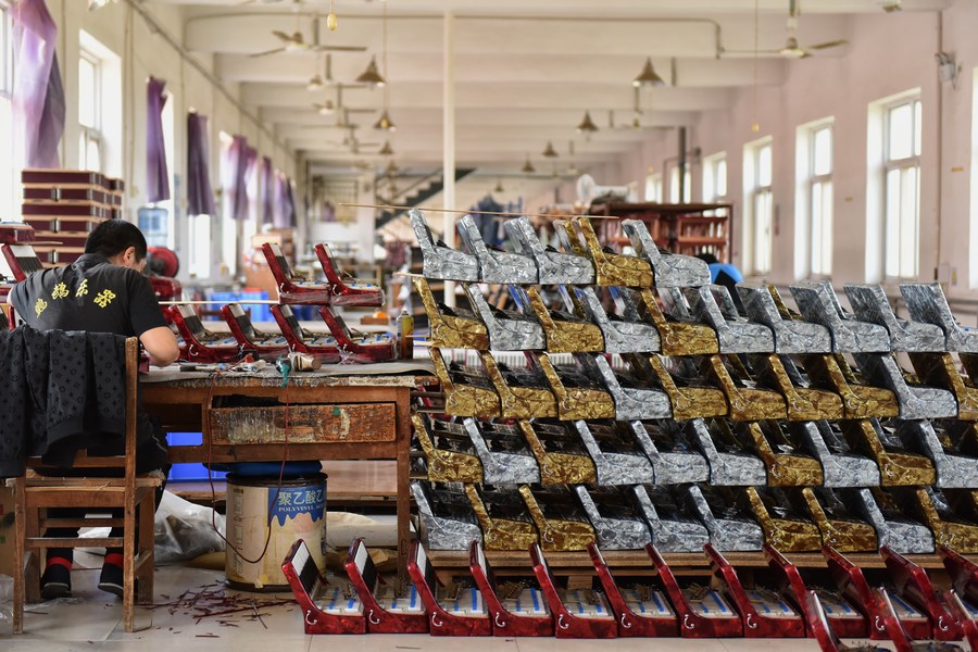 A worker produces the parts of accordions at a workshop of Tianjin Yingwu Musical Instrument Co., Ltd. in Zhongwang Town of Jinghai District, north China's Tianjin, May 25, 2023. (Xinhua/Sun Fanyue)
