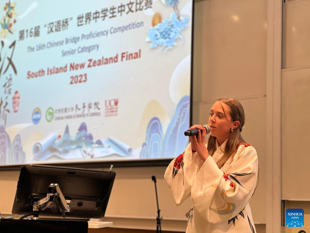 A contestant competes in the annual "Chinese Bridge" Chinese Proficiency Competition in Christchurch, New Zealand's South Island, May 28, 2023. University, secondary and primary school students from across New Zealand's South Island competed for Chinese proficiency in the annual "Chinese Bridge" Chinese Proficiency Competition held on Sunday.(Photo by Walter/Xinhua)
