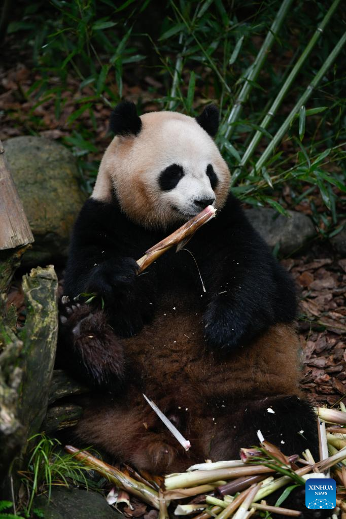 Giant panda Mei Lan eats fresh bamboo at Chengdu Research Base of Giant Panda Breeding in Chengdu, southwest China's Sichuan Province, May 29, 2023. Giant panda Mei Lan celebrated its 7th birthday at the Chengdu Research Base of Giant Panda Breeding on Monday. (Xinhua/Xu Bingjie)