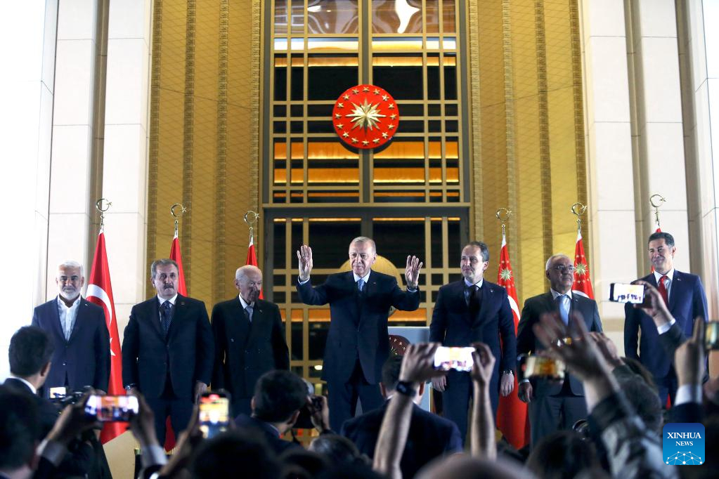 Turkish President Recep Tayyip Erdogan (C) waves to people in Ankara, Türkiye on May 29, 2023. Turkish President Recep Tayyip Erdogan was declared the winner of the presidential election on Sunday, sending him to another five years in office. (Mustafa Kaya/Handout via Xinhua)