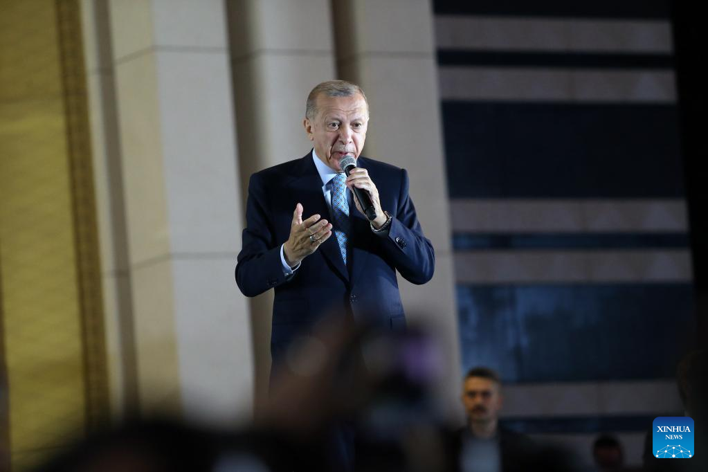 Turkish President Recep Tayyip Erdogan delivers a speech in Ankara, Türkiye on May 29, 2023. Turkish President Recep Tayyip Erdogan was declared the winner of the presidential election on Sunday, sending him to another five years in office. (Mustafa Kaya/Handout via Xinhua)