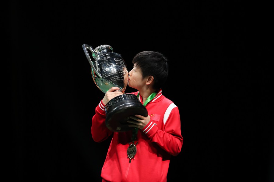 Sun Yingsha kisses the women's singles trophy after her triumph. (Xinhua/Han Xu)