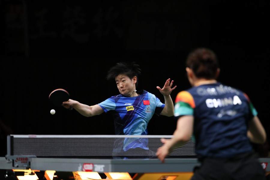Sun Yingsha (L) of China hits a return during her women's singles final against her compatriot Chen Meng. (Xinhua/Han Xu)