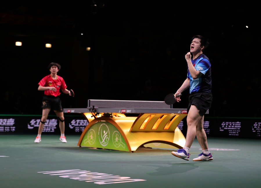 Fan Zhendong (R) celebrates a point during the men's singles final against his compatriot Wang Chuqin. (Xinhua/Wang Dongzhen)