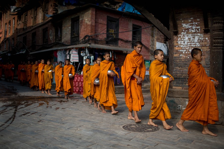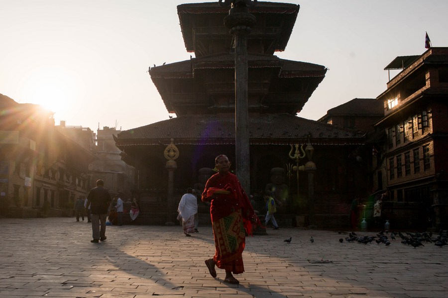 BHAKTAPUR, Nepal, May 31 (Xinhua) -- Basked in the soft glow of early morning, monks in orange robes and locals quietly walk to offer prayers on the premises of the Bhaktapur Durbar Square located in Bhaktapur, Nepal.