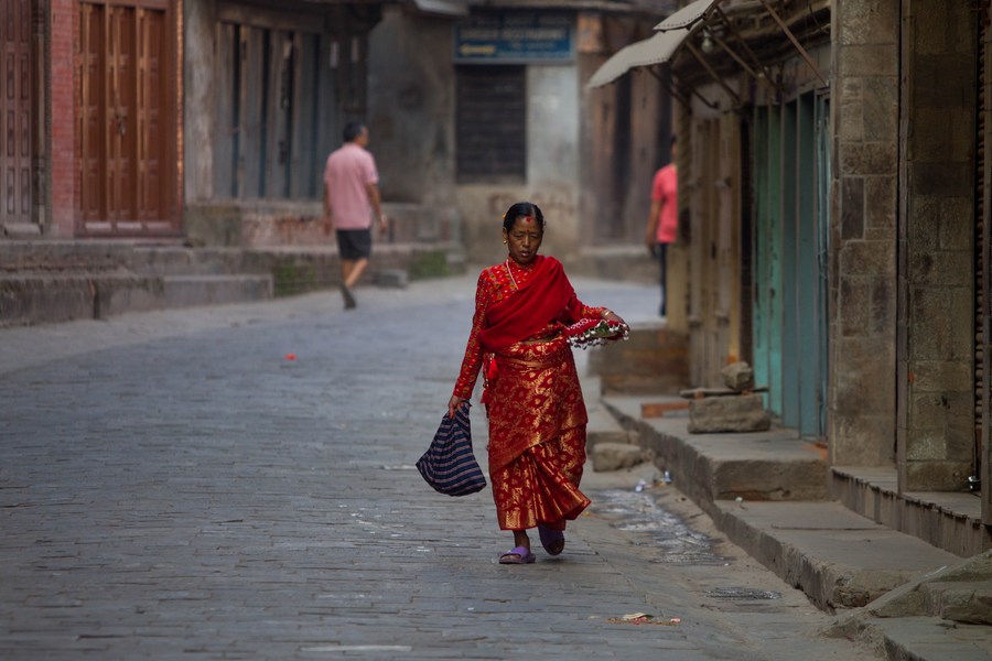 A woman walks on the street to offer prayers on the premises of the Bhaktapur Durbar Square, a UNESCO world heritage site, in Bhaktapur, Nepal on May 30, 2023. (Photo by Sulav Shrestha/Xinhua)