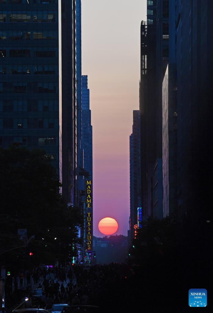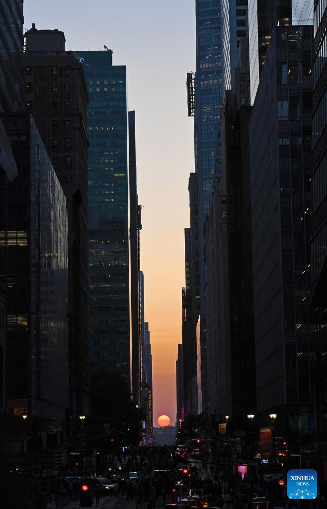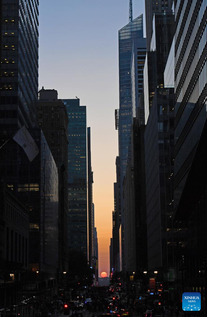This photo taken on May 30, 2023 shows the Manhattanhenge in Manhattan of New York, the United States. The Manhattanhenge refers to the twice-a-year circumstance during which the setting sun aligns precisely with the east-west streets of Manhattan. (Xinhua/Li Rui)