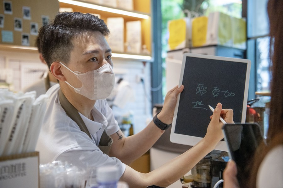 Zhang Lingyun communicates with guests through an electric blackboard at Yijiao Cafe located at Songshan General Hospital, Yubei District of southwest China's Chongqing Municipality, May 5, 2023. (Xinhua/Tang Yi)