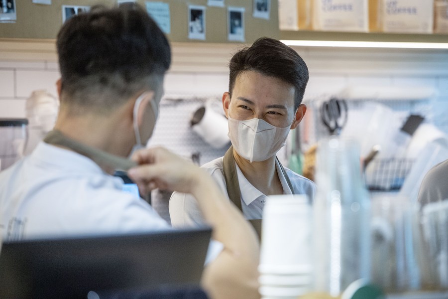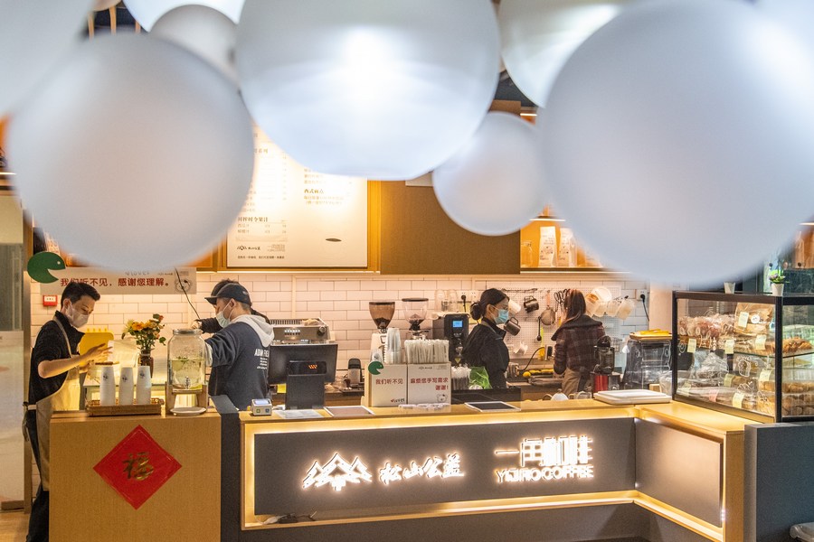 Zhang Lingyun (1st L) works at Yijiao Cafe located at Songshan General Hospital, Yubei District of southwest China's Chongqing Municipality, March 29, 2023. (Xinhua/Tang Yi)