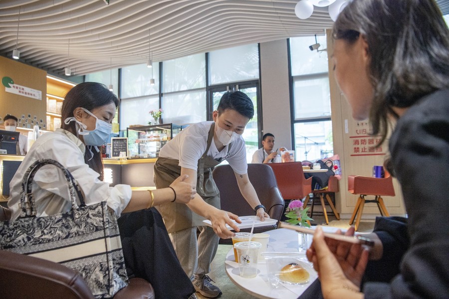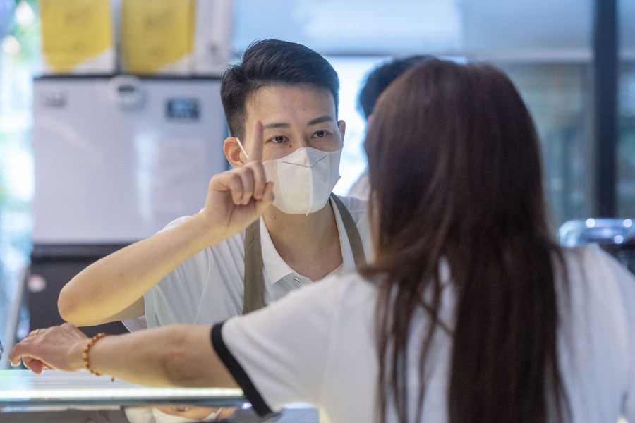 Zhang Lingyun (L) communicates with guests through sign language at Yijiao Cafe located at Songshan General Hospital, Yubei District of southwest China's Chongqing Municipality, May 5, 2023. (Xinhua/Tang Yi)
