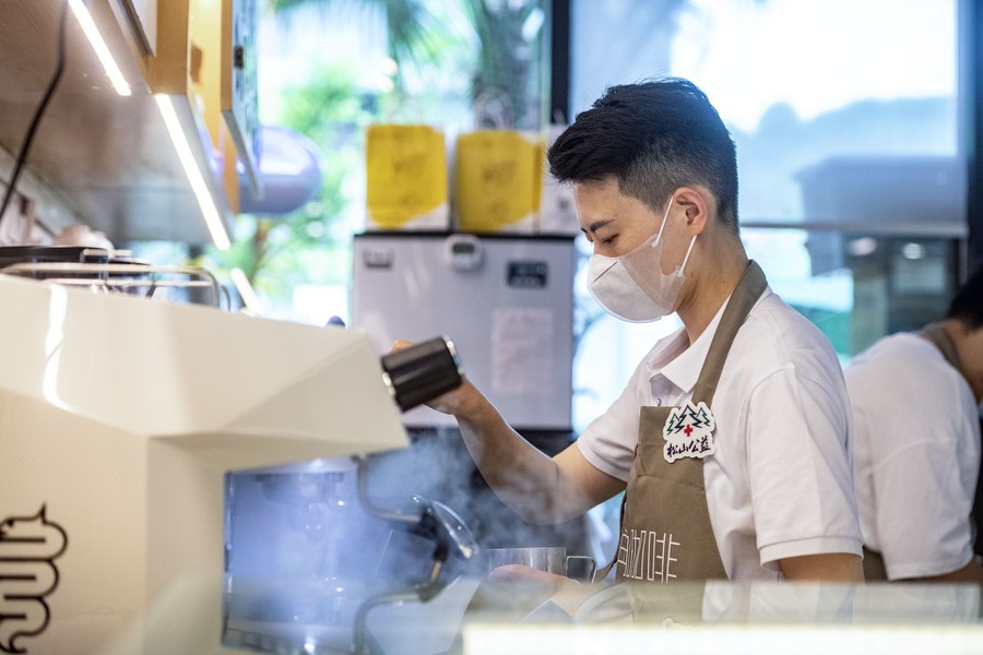 Zhang Lingyun makes coffee at Yijiao Cafe located at Songshan General Hospital, Yubei District of southwest China's Chongqing Municipality, May 5, 2023. (Xinhua/Li Qianlei)