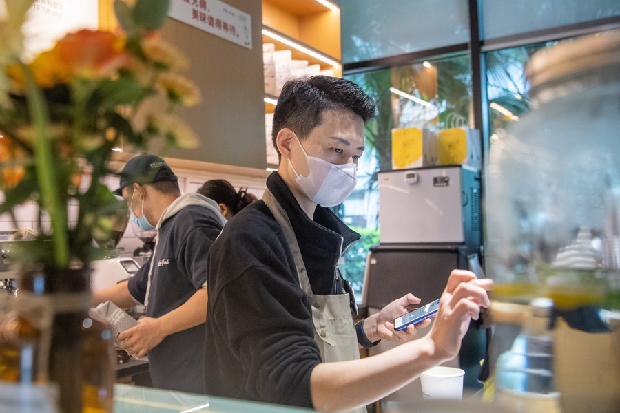 Zhang Lingyun works at Yijiao Cafe located at Songshan General Hospital, Yubei District of southwest China's Chongqing Municipality, March 29, 2023. (Xinhua/Tang Yi)