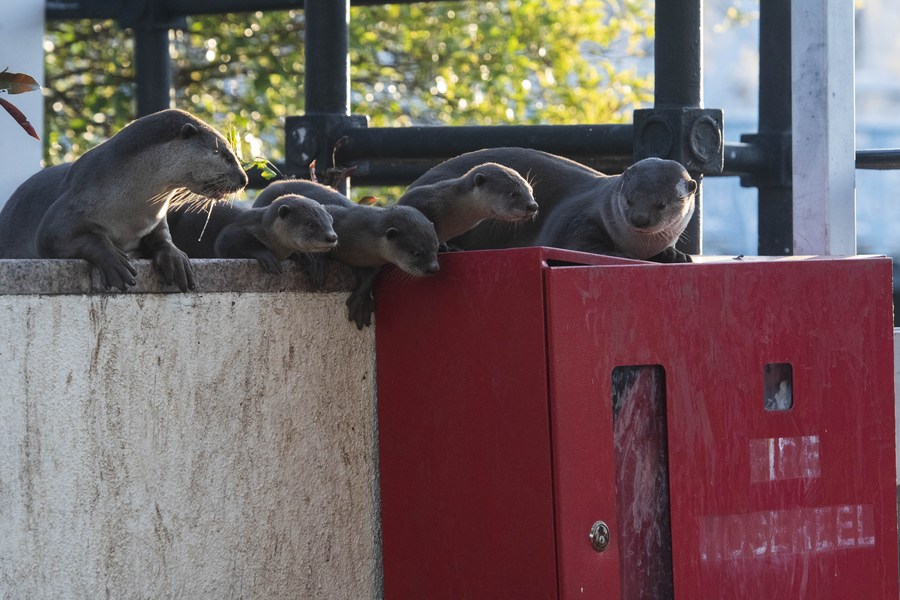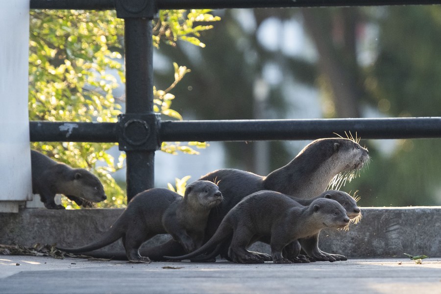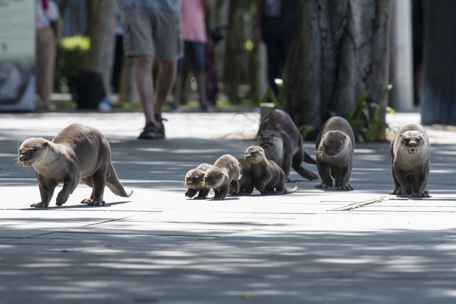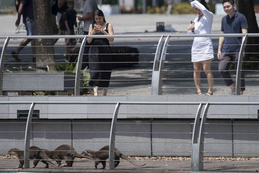 A family of wild smooth-coated otters make their way around Singapore's Marina Bay area on May 2, 2023. (Photo by Then Chih Wey/Xinhua)