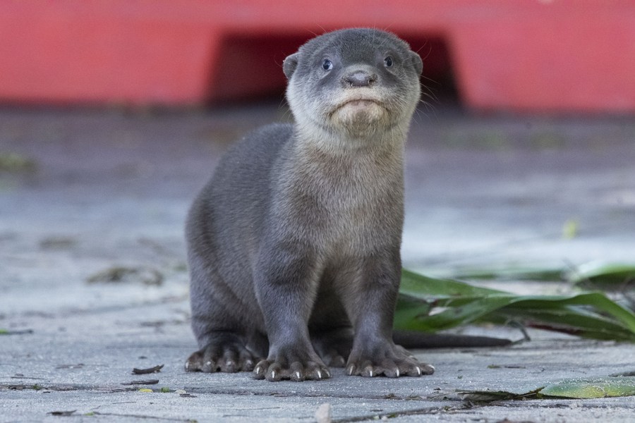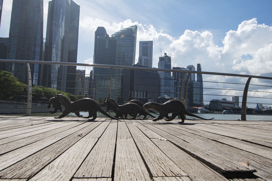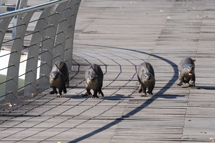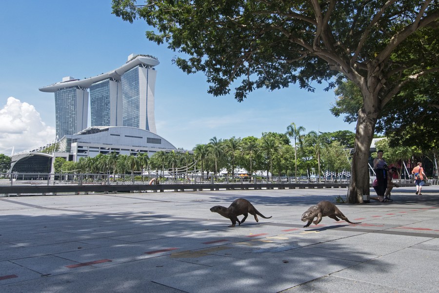 Wild smooth-coated otters make their way around Singapore's Marina Bay area on May 24, 2023. (Photo by Then Chih Wey/Xinhua)