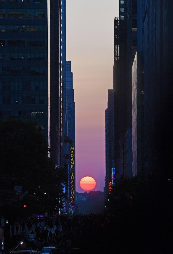 This photo taken on May 30, 2023 shows the Manhattanhenge in Manhattan of New York, the United States. The Manhattanhenge refers to the twice-a-year circumstance during which the setting sun aligns precisely with the east-west streets of Manhattan. (Xinhua/Li Rui)