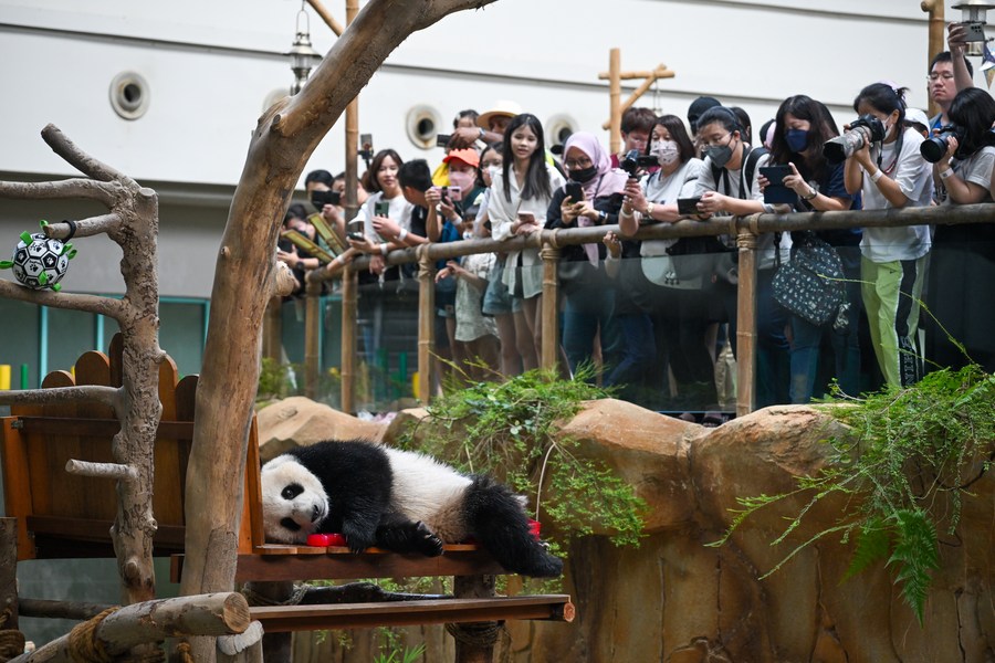 Giant panda Sheng Yi plays while celebrating its second birthday at the Giant Panda Conservation Center of Zoo Negara near Kuala Lumpur, Malaysia, May 31, 2023. The Giant Panda Conservation Center in Zoo Negara near Kuala Lumpur is currently home to a family of four, including the giant panda father Xing Xing, mother Liang Liang as well as their daughters Yi Yi and Sheng Yi. (Xinhua/Zhu Wei)