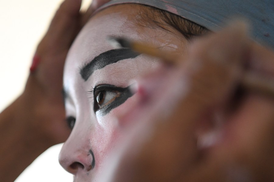 A student has his facial makeup applied by an elderly folk artist at Fuling Village of Jixi County, Xuancheng City, east China's Anhui Province, May 30, 2023. In order to promote Anhui Opera and raise awareness of the traditional performing art, a primary school in Fuling Village has been offering a routine training program since 2003 for its students, hiring veteran folk artists as tutors. (Xinhua/Zhang Duan)