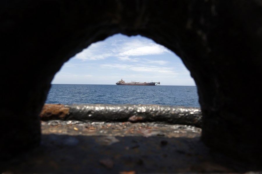 The FSO Safer vessel is seen at Ras Issa port in Hodeidah province, Yemen, on May 30, 2023. A United Nations (UN) ship arrived on Tuesday at the site of the floating storage and offloading (FSO) Safer vessel, a decaying super oil tanker, off the coast of Ras Issa, Hodeidah in western Yemen. (Photo by Mohammed Mohammed/Xinhua)■